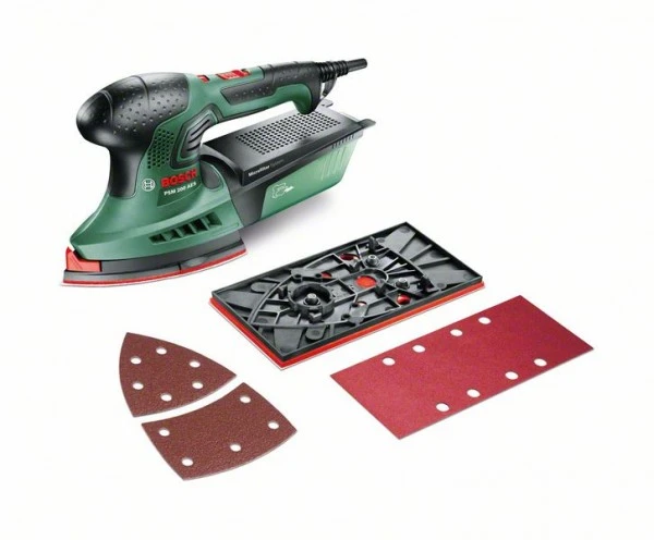 Multischleifer PSM 200 AES, Leistungsstarker Multischleifer mit Schleifplattenoptionen und Drehzahlregelung, Umfasst drei- und viereckige Schleifplatte für die Bewältigung verschiedenster Projekte, Einfacher und schneller Schleifvorsatzwechsel durch SDS-System, Elektronische Drehzahlvorwahl sorgt für die perfekte Drehzahl passend zu Arbeit und Material, Ideal zum Schleifen mittelgroßer und größerer flacher Oberflächen sowie von Ecken und Kanten, Für die Bearbeitung von Oberflächen aus Holz oder Metall sowie gestrichener und lasierter Oberflächen, Rechteckige Schleifplatte (2 609 256 D19), 1 Schleifpapier (bügeleisenform) K 80, 1 Schleifpapier (rechteckig) K 80, Kunststoffkoffer