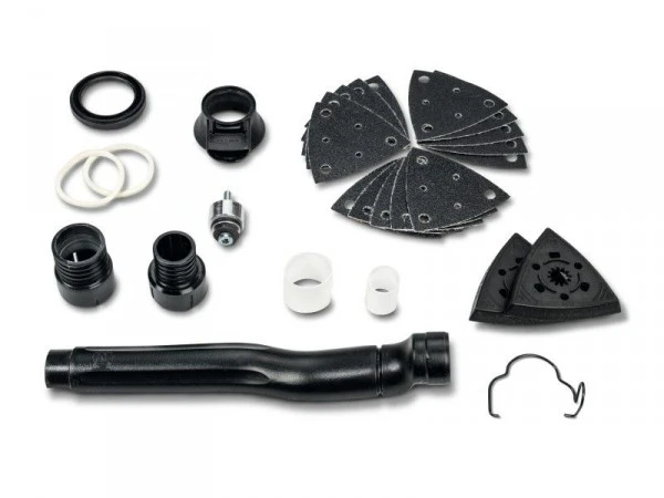 Für alle Schleif- und Raspelarbeiten mit dreieckiger Schleifplatte und Hartmetall-Raspel, inkl. 2 Schleifplatten, gelocht; je 5 Schleifblätter, gelocht, Korn 60, 80, 120; 1 Absaughaube mit Saugrohr; 2 Schlauchtüllen für Schlauchanschluss Ø 27 und 32 mm sowie 2 Adapter zum Anschluss an die gebräuchlichsten Haushalts-Staubsauger. Für FSC 2.0 Q.