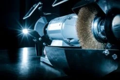 • Feine (K60) Korund-Schleifscheibe für alle Schleif- und Schärfarbeiten und eine Drahtbürstenscheibe