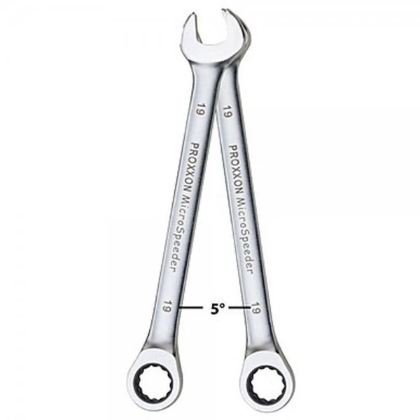 Durch 72-zahnigen Innenring aus hochlegiertem Spezialstahl erfolgt der Antrieb bereits bei einer Hebelbewegung von 5°. Dennoch liegen die übertragbaren Drehmomente weit über DIN/ISO. Schäfte aus CrV-Stahl mit optimalem Oberflächenschutz: 2x vernickelt und 1x mattverchromt. Deutlich lesbare Schlüsselweiten durch Laser-Markierverfahren!