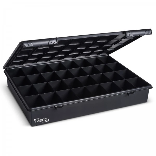 ESD Assorter 4-32. Ausgestattet mit 2 Schiebeverschlüssen. Mit U-Profilen im Deckel, die ein Verrutschen des Inhalts beim Transport verhindern.