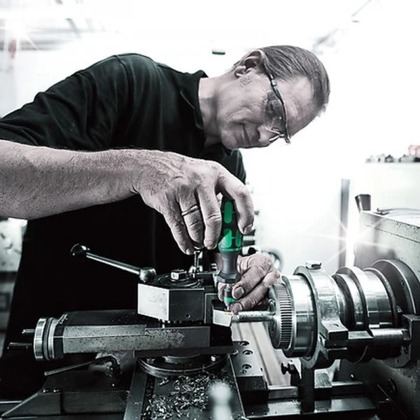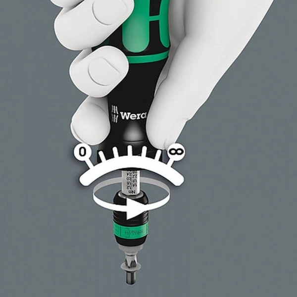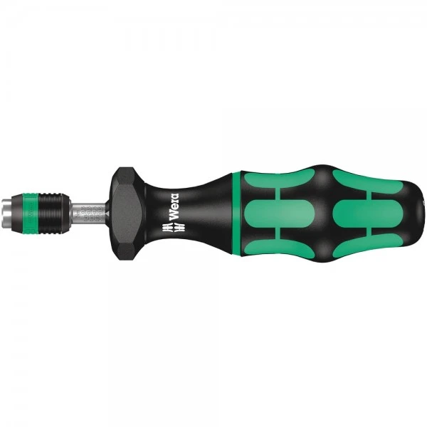 Wera Drehmomentschraubendreher. Variable Drehmomenteinstellung bei höchster Genauigkeit. Einfache Einstellung des benötigten Drehmomentwertes ohne Sonderwerkzeug. Gute Ablesbarkeit des Skalenwerts. Mit Klicksignal. Rapidaptor-Schnellwechseltechnologie fĂĽr blitzschnellen Bit-Wechsel. Unbegrenztes Lösemoment zum Lösen festsitzender Schrauben. Mehrkomponentiger Kraftform-Griff mit Hart- und Weichzonen fĂĽr hohe Arbeitsgeschwindigkeiten und zur Schonung der Handfläche. Geeignet fĂĽr Bits mit 1/4″-AuĂźensechskantantrieb nach DIN ISO 1173-C 6,3 und E 6,3 (ISO 1173).